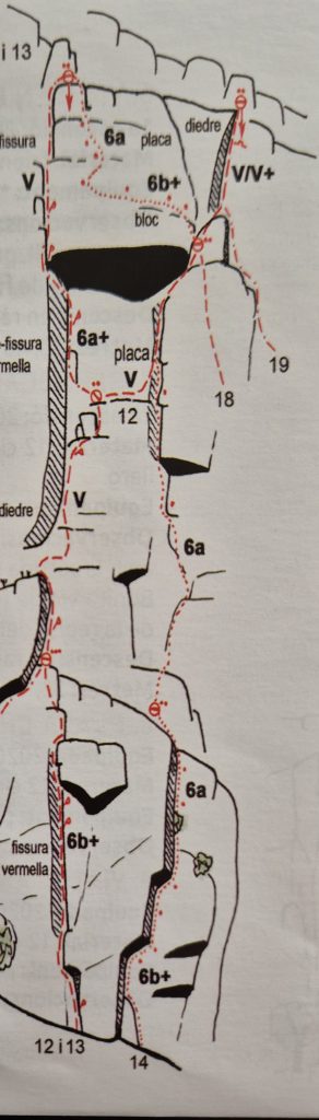 L1 (35m, 6b+): El primer llarg comença amb un fàcil repetjó de 4 o 5 metres, amb fissura per la part dreta, que ens condueix sota un gran sostre, la base del qual ens ofereix una fissura invertida que insinua el camí a seguir per superar-lo. Al cim del repetjó inicial hi ha un petit, però còmode replà des del qual xapem el primer parabolt i comença la festa. La fissura no és del tot dolenta, però no ajuda que els peus siguin pocs i precaris. Amb més manya que força comencem el ball que la paret ens demana per anar avançant lentament, però amb solvència, fins deixar el sostre a l’esquerra i encarar el següent tram vertical equipat amb 2 parabolts més. Comença amb una gran fissura a l’esquerra. Buscant trobarem bones preses, però caldrà seguir jugant amb l’equilibri perquè la paret ens vol escopir avall. Quan la fissura acaba, toca sortir per la placa cap a la dreta, on ens espera una última apretada que exigeix altra vegada bona tècnica de peus per sortir airosos. Finalment, a la base d’un arbret que llacem, acaba el tram dur del llarg. La segona part del llarg és un tram semiequipat on la dificultat relaxa clarament. Un camalot del 3, un tòtem negre, un arbre… ens adonem de la bellesa de l’entorn i la qualitat de l’experiència, un parell de parabolts, gaudint com un nen petit, un tòtem taronja i… reunió!!!