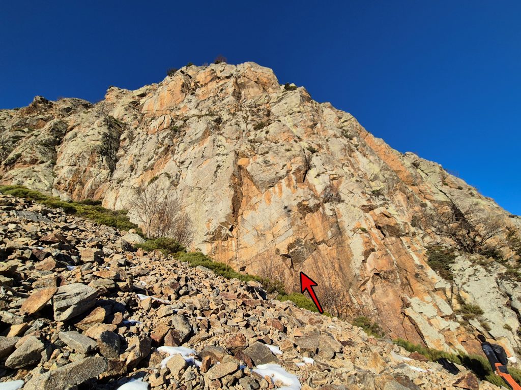 Veurem clarament la gran paret de la Dent d’En Rossell a la nostra dreta, i la del Cingle de Palanca, més discreta, a la nostra esquerra. Arribats al peu del cingle doncs, seguirem uns pocs metres cap a l’esquerra en busca del peu de via. Podem fer-ho arran de paret, o més allunyats per la tartera per tenir una millor perspectiva.