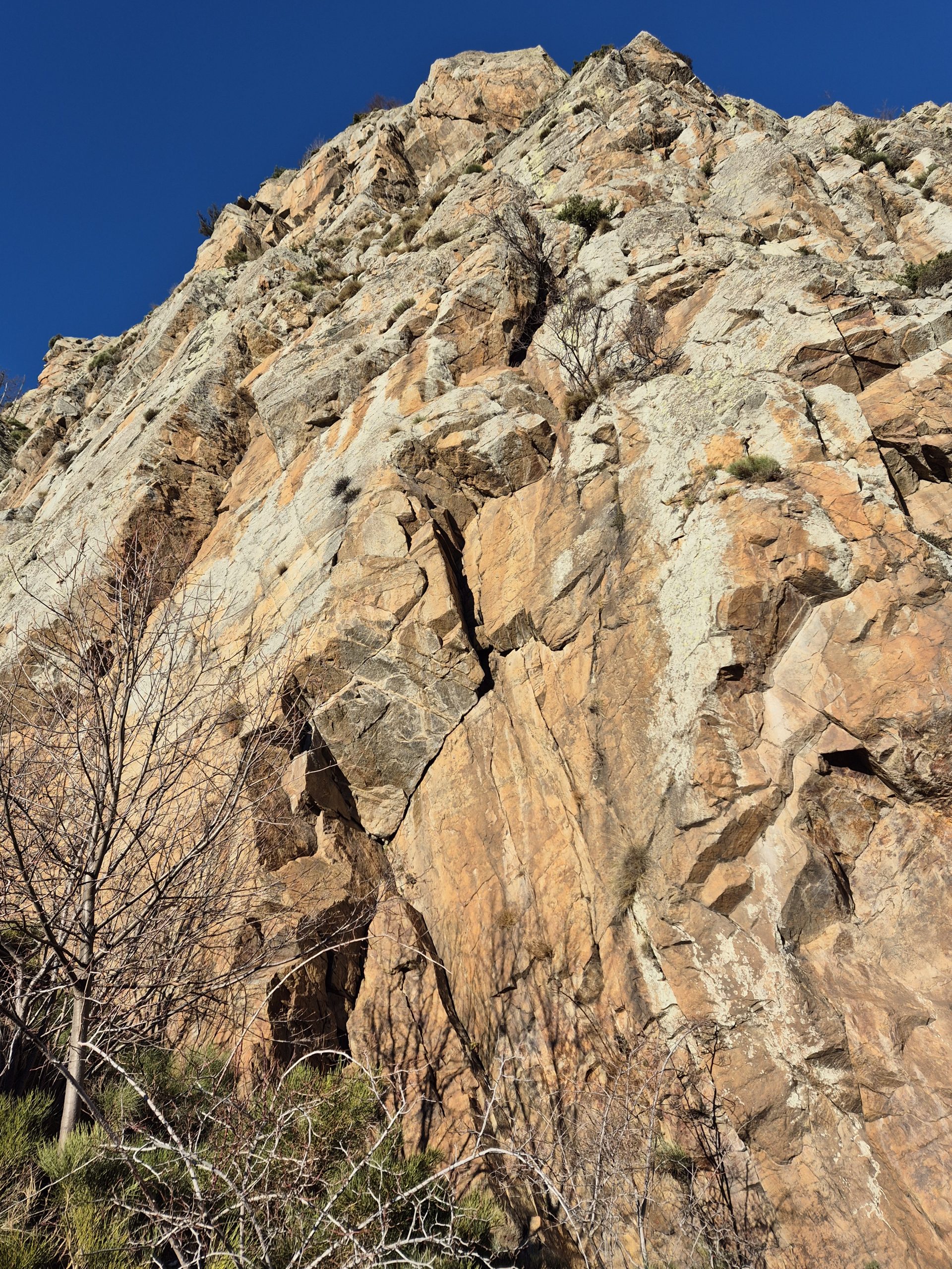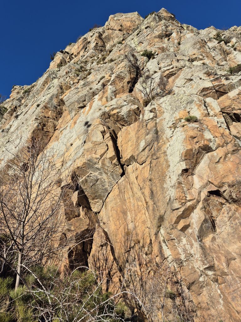 L2 (30m, 6a): Aquest llarg té un parell de parabolts, la resta a amanir. Comencem per una placa, deixant un matoll a l’esquerra fins a caçar el primer parabolt. A l’esquerra hi tenim fissura, que ens demana posar-nos-hi bé en el seu inici per equipar-la. Hi entra un Totem verd i el Cam 3. Seguim la progressió, ja amb més comoditat, per la fissura i aquí aniria bé tenir el Totems verd i vermell repetits. L’Àngel opta per fer córrer el Totem vermell un parell de vegades fins la fi de la fissura on xapem l’últim parabolt. Només ens queda sortir cap a la dreta per la placa en busca de la reunió, que queda a l’ombra darrere d’un mur. Aquí fa rasqueta….